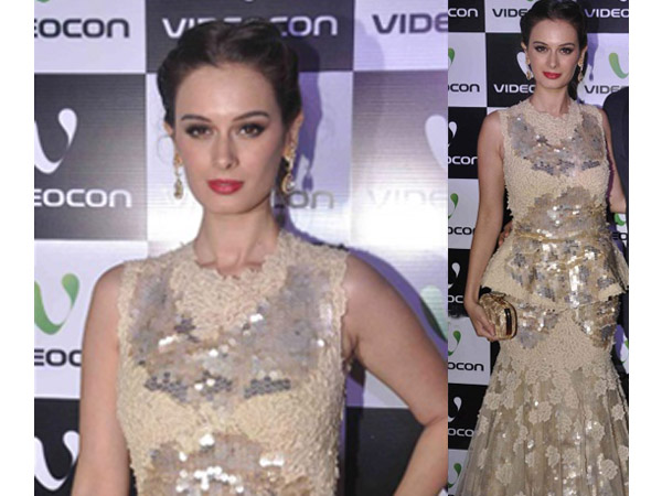 Eveyln Sharma wore Rocky S gown with jewellry from Gehna at the Videocon event. She looked good in the sequined gown.
