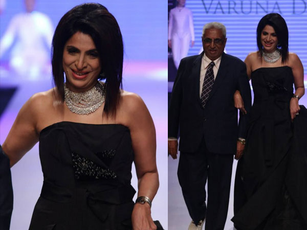 Varuna walked the ramp with her father as a showstopper. She wore an collar encrafted silver necklace and minused on earrings.
