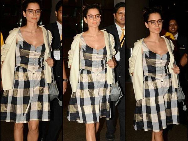 Kangana repeated her checkered Vivienne Westwood dress while arriving from London. Kangana wore the knee length checkered white and black Vivienne Westwood dress with brown suede classic boots.