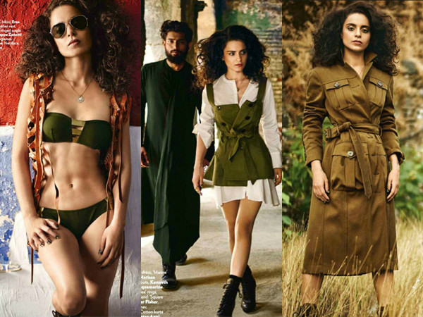 Here Kangana is wearing a military coloured bikini with a leather cut out vest. She finished her look with a curly fluffled hairdo and a Marc Jacobs sunglasses.
