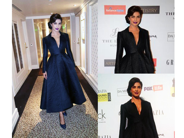 Priyanka Chopra in Ashi Studio couture gown was spotted at the Grazia Young Fashion Awards 2015. The black coat styled gown that Priyanka Chopra wore was surely a beautiful piece but could have spiced it up with more colour.