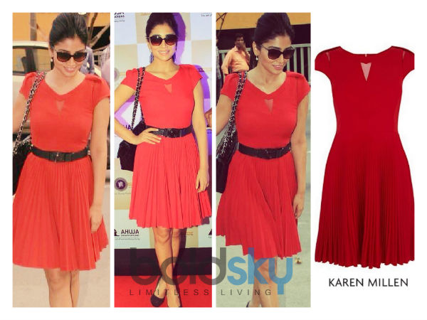 The Karen Millen red dress looked all the more smart on Shriya as she pumped it up with Chanel Jumbo shoes. Shriya added another look to her attire. It was a new hairstyle. From the plain and boring straight hair, Shriya opted for a poofy ponytail to add essence to her red ensemble.
