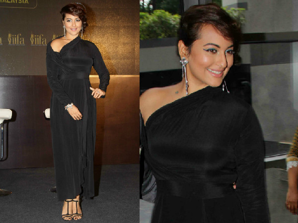 Sonakshi Sinha wore Anand Kabra black dress at the IIFA opening night press meet with a thin strap shoes looking interestingly different and nice.