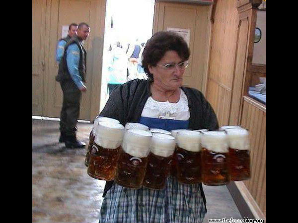 The attitude of the old woman clearly states, "these beer glasses are mine and I shall have it!"