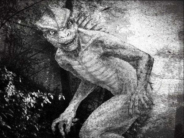 It is said that this horrifying object inhabit the swampland areas in and around Lee County, South Carolina. The 7 feet 2 inches tall, bipedal, with a strong build, green scaly skin and glowing red eyes has 3 toes, and hangs from ceilings and walls.