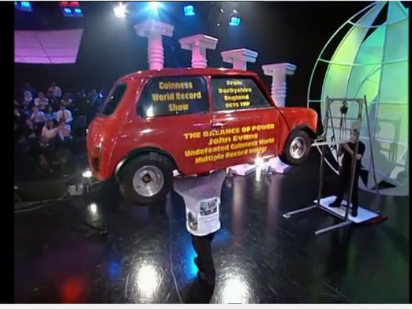 Balancing The Weight Of The World - If you thought that you are the only one carrying the weight of the world on your head, then take a look at John Evans. In 1999, John balanced a 352 pound gutted Mini car on his head and so far, no one has been able to break this deadly record.