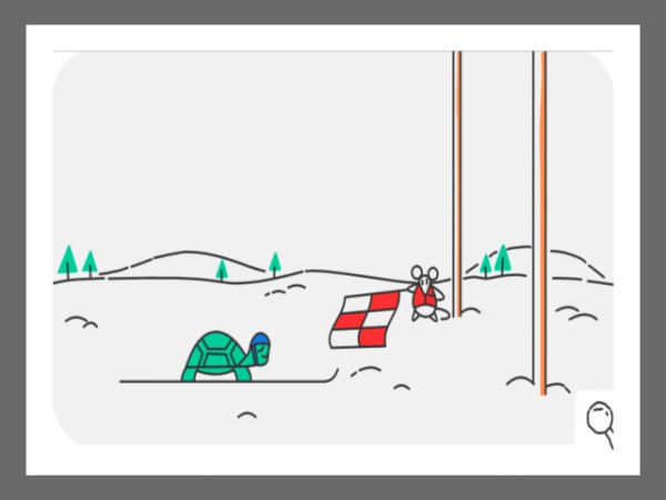 In this doodle, we can watch the hare and tortoise in the competition. The moment the race is flagged off by the referee mouse, the hare initially is seen heading the race with a flying start at a speed of 64 kmph. On the other hand, the tortoise starts inching forward with full determination, but is just too slow.