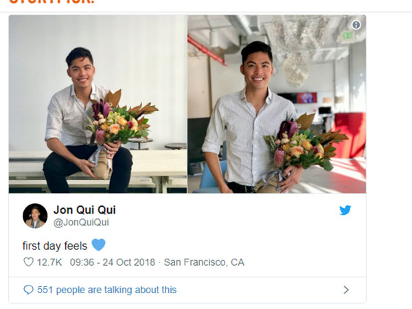His new colleagues noticed that he was super happy and was striking poses with the flowers. He shared his first day experience on his Twitter account and captioned the post as, "First day feels <3".