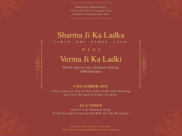 It is a parody wedding invitation card that talks about 'Sharma Ji ka ladka' getting married to 'Verma ji ki Ladki'. The comedian also gave a hashtag #ShaVerma for the couple to show the craze among couples for having their own wedding hashtag.