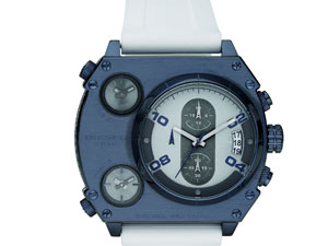 The rugged white leather strap stands out against the round brushed and polished case with marine blue IP plating, white dial and blue second hand. On style, a white silicone molded strap with a marine blue IP crown and pushers has a silver dial with a grey-blue sub eye and a honeycomb texture. Digital style, is a first for Diesel with its stainless steel case in a white silicone strap. The pushers and top ring are in matte marine blue and the top ring has added knurling texture.