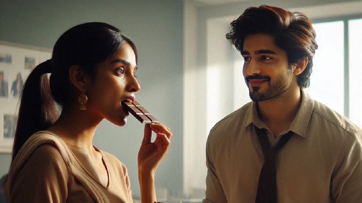 They stood there, in the quiet of the office, nibbling on chocolate and letting the conversation settle into something more natural-comfortable, without the looming weight of unanswered questions. There was no rush to define anything. No pressure. Just the sweetness of a shared moment that didn't need to be anything more than it was.