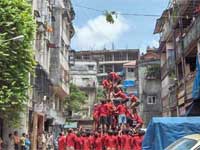 In some places, a series of pots are placed one on top of the other, held together by means of a rope. The contents of the pots are different in each like curd, butter milk, butter etc and held together and suspended by the means of a rope. Human pyramids are either formed to reach the pot or the contestants are given a stick to hit the pots when they are brought down by the means of a pully. It is a difficult task indeed as it is pulled up immediately when the contestants try to hit it.