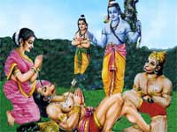 Vali had such great power, that any time an enemy approached him, half the strength of the enemy would drain away and Vali would become three times stronger. So, Rama had to kill him from behind. To whom should he then give the kingship of the monkey-clan - the thoughts? To whom better than Sugreeva? Greeva means reins, "Sugreeva" means well-reined, i.e well-controlled. When the thoughts are under one's control, the army is then available to cross the frontiers and reach Lanka to kill the ten headed monster and bring back Sita.