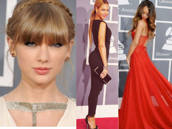These best dressed celebrities walked the red carpet of the prestigious award function in designer outfits with stunning accessories. To carry the perfect look for the gala event, we saw many celebrities who tried different hairstyles to get the divalicious look. For example, Taylor Swift who looked sophisticated in a creamy white thigh-high slit gown chose to opt for a classic milkmaid braid hairstyle. However, Jennifer Lopez who wore a dangerous thigh-high slit gown tied a tight top knot bun which looked odd. Lets take a look at the different hairstyles that we spotted at the Grammy Awards 2013.