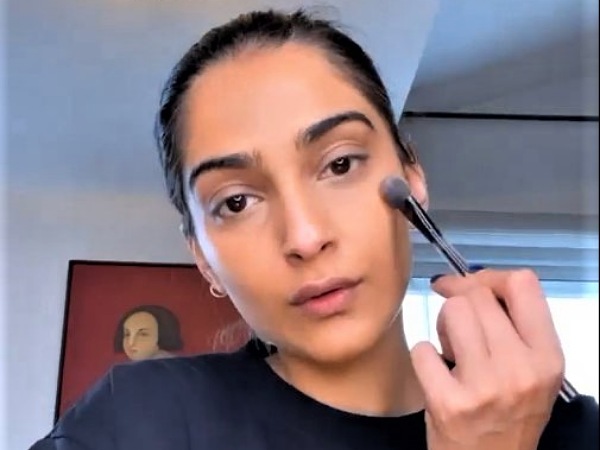 So, in the video Sonam Kapoor Ahuja was seen sporting a simple midnight-blue tee while her hair was tied back into a neat and tight bun. Starting with her makeup routine, she first picked a CC cream and showed that she opted for it instead of foundation. Because blending foundation may take a lot of time, she blended the CC cream perfectly, using a beauty blender. Then, she picked a concealer and applied it under her eyes. She blended it, using her fingertips. Next, Sonam applied compact powder to set the concealer in place. The actress then opted for a pink blush and with the help of blush brush, she applied it softly on her cheekbones.