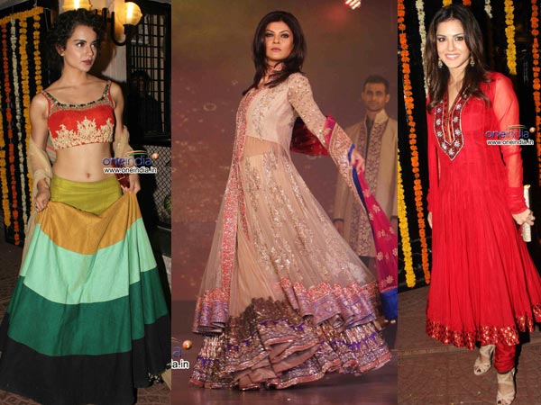 If you are blessed with amazing height like Sushmita Sen, then you can certainly try this frilly gharara-style outfit. The shocking pink dupatta contrasts with the cream coloured lehenga.