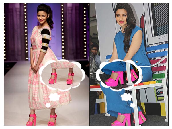 The hot pink sandals which Alia Bhatt wore on the Day 1 of Wills India Fashion Week are surely one of a kind but what is making her repeat her sandals again that too so soon? Few days back we spotted Alia wearing the same pink heels by Topshop at the launch of Maybelline event.