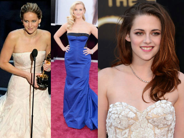 Celebrities like Jennifer Lawrence, Anne Hathaway, Kristen Stewart, Amy Adams, Charlize Theron, Jennifer Garner, Jennifer Aniston and many other wore strapless gowns and flaunted their jewels at the Oscars 2013 red carpet. Seems like strapless gowns are the new fashion trend post Academy Awards 2013. Lets take a look at the red carpet fashion at Oscars 2013.
