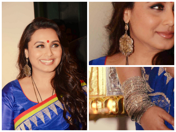 She opted for a small red bindi on her forehead to match the border of the saree. Rani wore silver leaf structured earrings and multiple silver bangles to complete the look. The newly married Rani Mukerji also showed off her mangalsutra.