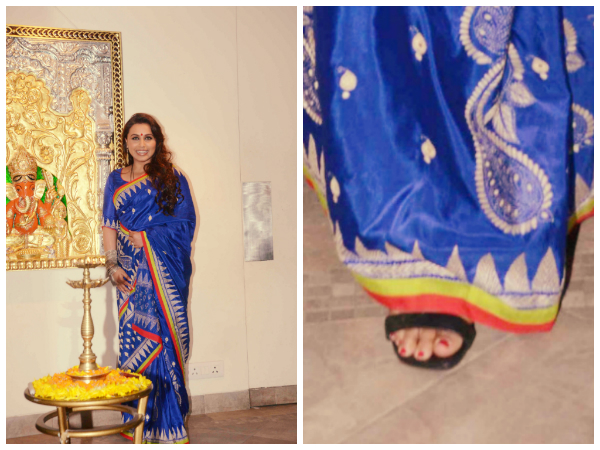 She highlighted her beautiful cobalt silk saree style with a pair of black open sandals that showed off her red polish on her pedicured nails.