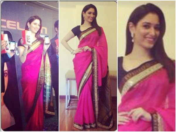 The bright fushcia pink and black saree on Tamannaah Bhatia is the best we have seen so far. The actress teamed this traditional attire with gold jewellery designed by herself. What was surprising though is the way she draped the pink saree - so South Indianish!