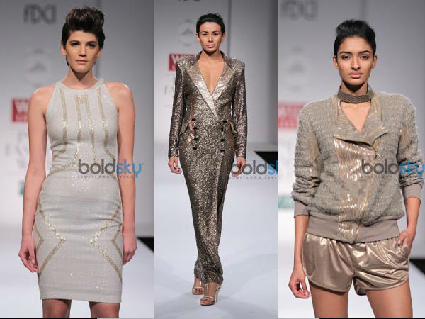 Saaj by Ankita was a glitzy collection at Day 4 of Wills India Fashion Week 2014. The collection which is named Arabella is all about metallic and sequins detailing. Ankita's gold and white sequin work dazzled at the ramp of WIFW.