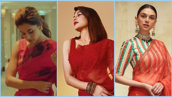 Today is the sixth day of Navratri festivities and the day is also called Shashthi - symbolised by the red hue. The colour signifies passion, health, and courage - the colour of love. If you are looking forward to flaunting red hue today, we have you covered (and we know that you all love the colour red). However, this time, we have three red saree looks for you but all crafted from the lightweight organza fabric. And Aditi Rao Hydari, Jacqueline Fernandez, and Taapsee Pannu are here to inspire you with their red-toned organza sarees.