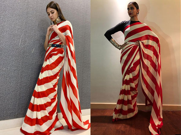 Coming to Deepika first, the 'Padmaavat' actress donned this absolutely delightful red and white striped sari for an event, where she received an award from the Italian Consulate. She teamed this sari with a white tiger crest kamarbandh belt, which also gave this sari a structural turn. The diva paired and colour-blocked this sari with a black blouse that was full-sleeved. She accessorised her look with delicate earrings. Her makeup was highlighted by a deep red lip shade and the impeccable bun rounded out her look.