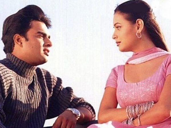 So, Dia Mirza was decked up in a light-pink ethnic suit, while she was sitting on a bench with R Madhavan, who played the role of Maddy (Reena's lover) in the film. Her suit consisted of a half-sleeved round-collar straight kurti, which was accentuated by subtle striped patterns and side slits. She teamed her kurti with matching churidar bottoms and draped a dual-toned (pink and white) dupatta around her neck. The actress accessorised her look with a pair of light-pink hoop earrings and bangles on her both hands.
