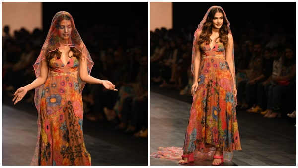 Detailed to perfection, Rhea's orange ensemble had cutwork details at the waist and a backless design. The floral outfit was layered with a matching, flowy veil. Rhea looked like an angel on the ramp!