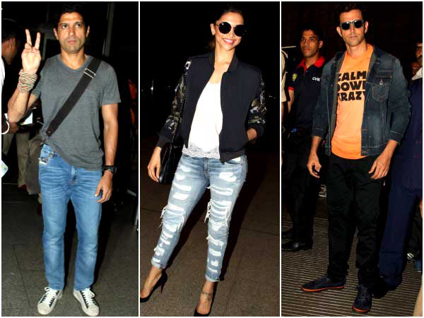 Hrithik was dressed in an orange shirt with a denim jacket on and a pair of black shoes with a matching orange lining. Deepika Padukone was spotted in the season's coolest ripped denims paired up with a white tank, black jacket and sexy black heels. The best part about both their looks were the sunnies.