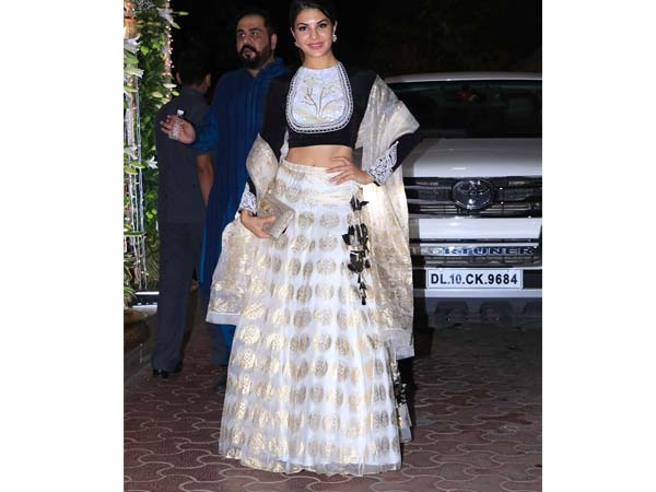 Jacqueline carried a small black and gold clutch with her and she wore intricate earrings, which went well with her outfit. The actress wore a slightly heavy makeup but pulled off her look effortlessly. Her makeup was dewy and marked by a bold red lip shade and smoky kohl. The impeccable bun notched up her look.