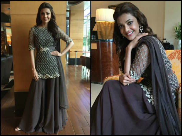 Kajal was attending a Bru Coffee event in Chennai when we spotted her wearing a grey Ridhi Mehra ethnic dress.