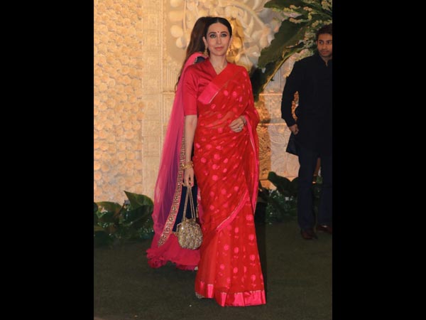 So, Karisma Kapoor wore a red and pink Raw Mango sari. Her sari was splashed in red hue, while the border of her ensemble was accentuated by a pink hue. The border of the drape of her sari was enhanced by metallic accents. It was a minimal and understated number with pink floral accents. Well, Karisma's sari was lovely and she paired it with a half-sleeved collared blouse, which went well with her sari.