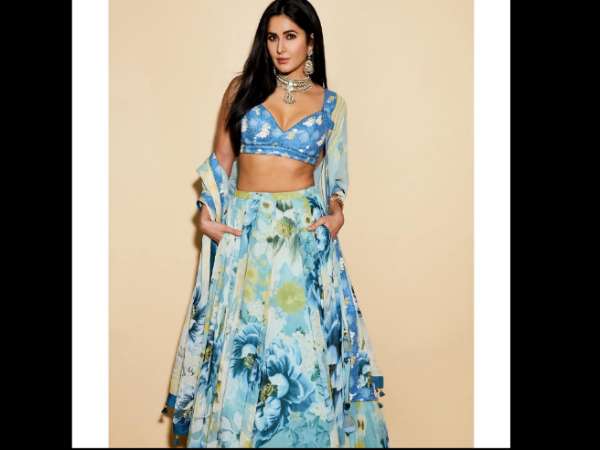 The actress wore a blue-coloured lehenga, which consisted of a cropped blouse and voluminous skirt. It was a pastel-hued number, which was adorned with stunning floral prints in the shades of blue and green. Katrina's attire was soothing and made her look a class apart at the occasion. The attire even had pockets and she teamed her ensemble with a complementing dupatta.