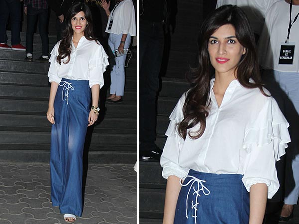 At the screening, Kriti picked a bright white top with flared sleeves and matched it with high-waisted tie-up blue flared pants.