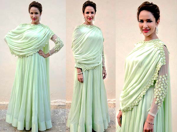 Lakshmi looked ethereal in a Ridhi Mehra outfit for the occasion. The mint-green stylised gown had a flowy skirt to it with one sheer sleeve that had floral embroidery on it. The torso had gathered fabric with delicate Grecian drapes to it, which ended on one shoulder.