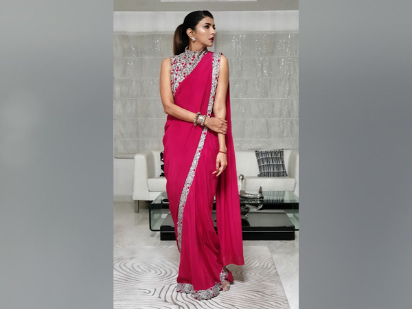 Her sari was designed by Rishi & Soujit. It was a vibrant pink-hued sari that was beautifully draped and the blouse was elaborated by ivory hue and pink-toned floral accents. It was a sleeveless high-neck blouse and the border of her sari matched with the blouse. Well, with this sari look, Lakshmi Manchu gave us cues on how to team a plain sari with an intricately done blouse.