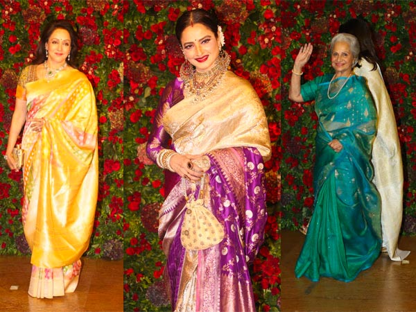 The golden divas also graced the wedding reception of Deepika Padukone and Ranveer Singh. They looked resplendent in their saris and each gave us a sari goal. Yes, Waheeda Rehman, Hema Malini, and Rekha looked gracious and proved that beauty is timeless. Let's find out what sari did they wear.