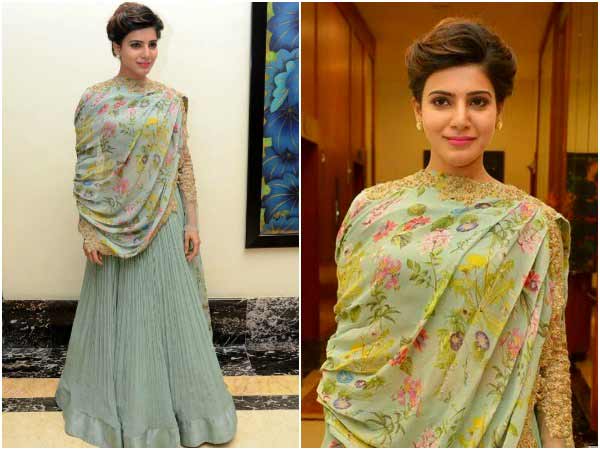 She completed the look with Amrapali Jewellery. The pale gold embroidery, holding the drapes across the shoulder, also complemented the look quite well. Do let us know what you thought of Samantha's outfit.