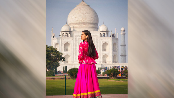 Sara Ali Khan looked awesome in her pink ghaghra set as she shared her pictures from the sets of Atrangi Re. She wore a vibrant ensemble and with her vivacious personality in the movie, won us with her performance. She captioned her picture as, "This photo accurately depicts how I'm feeling after getting so much ❤️ for Atrangi Re 💃💃💃 (The second photo is just my mandatory Taj Mahal posed picture 🤪)." Let's decode her ensemble and look.