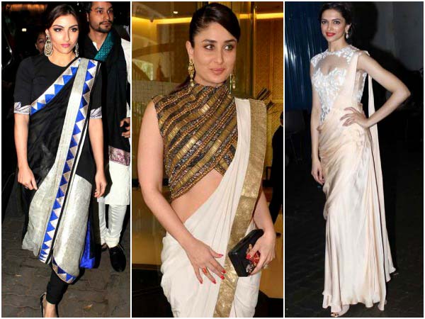 Are you one of those who love to try out different things? Then take inspiration from Kareena's boho saree gown. The shirt, loose pleats and heavy oxidised jewellery. You'll be the boho fashionista of the group.
