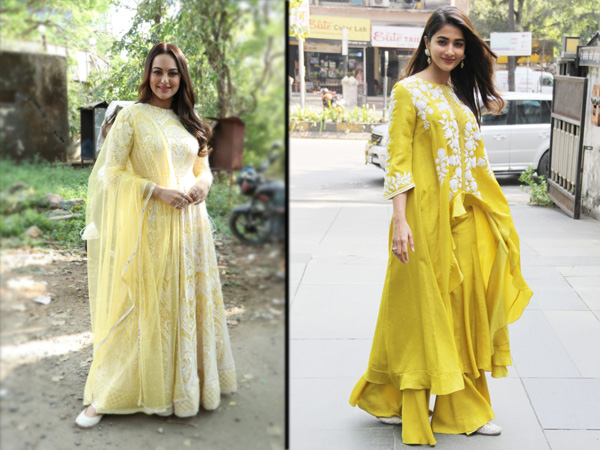 Both Sonakshi Sinha and Pooja Hegde were spotted in the city recently. They both flaunted yellow outfits and highly impressed us with their stylish looks. While Sonakshi went for a lighter hue, Pooja opted for a more vibrant number. They both gave us festive-perfect outfits. Let's take a look at their fashion game.
