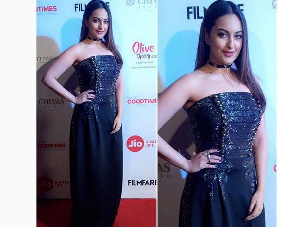 Recently, Sonakshi Sinha was spotted at the Jio Filmfare pre-party. She stepped on the red carpet wearing a beautiful shoulder-less dress designed by Pankaj and Nidhi. She dazzled in a beautiful black military gown that looked perfect on her.