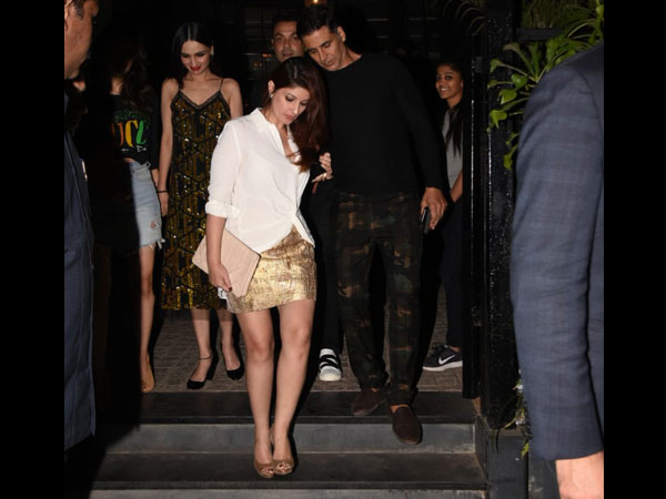 So, the 'Pyjamas Are Forgiving' writer was joined by Bobby and Tania Deol and Sunny and Anu Dewan at a restaurant in Juhu. Twinkle sported a casual shirt, which was folded and white-hued. The shirt was knotted at the front and featured a sheer touch. It was a slightly long shirt, which Twinkle teamed with a contrasting structured skirt that was accentuated by golden metallic detail. It was a well-coordinated outfit and Twinkle pulled it off effortlessly.