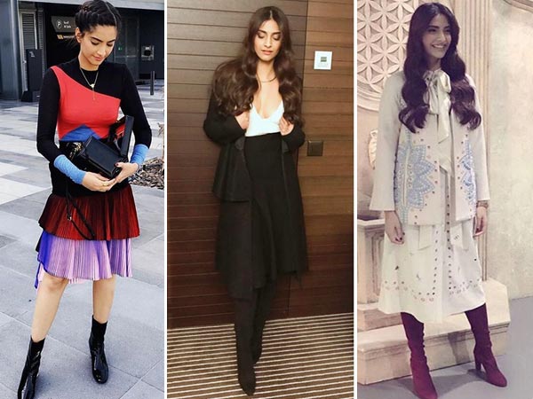 Sonam wore this chic and sophisticated dress for a brand's event. A full sleeved grey dress paired with ankle high black boots.