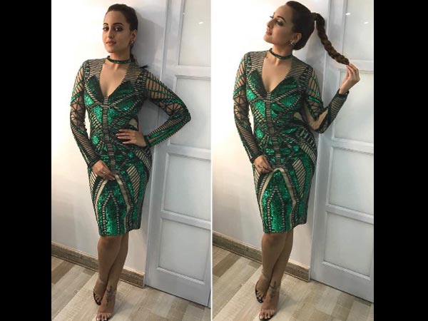 She was wearing a shimmery metallic green dress by Falguni And Shane Peacock. We do not require to mention, she looked HOT. The glamour queen looked extremely gorgeous in the body hugging dress and Sonakshi looked too hot to resist.
