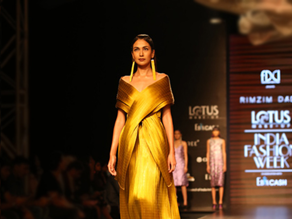 Rimzim Dadu presented her signature sculptural and fluid outfits but this time, she showed the discerning audience a wider range of ensembles. We loved the designer's collection but the one that we couldn't take eyes off was the golden gown. The model, who sported this gown looked like a ray of sunshine. Structured and folded, this gown was plain-hued but highlighted by metallic accents. It was definitely a traffic-stopping number and we totally liked the long spiky danglers, which went well with her gown.