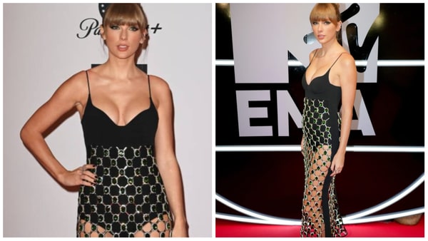 Taylor Swift aced the red carpet appearance at the MTV EMA 2022 event that took place on Nov 13 in Duesseldorf, Germany. The diva opted for a black figure-hugging bodysuit dress by Global designer David Koma. Her chosen ensemble featured a fit and flare silhouette and was crafted with a bejewelled chain design on the skirt. The jewels including emerald stones and tiny crystals were added to the mesh-like pattern of the black attire which appeared sparkly and dramatic!