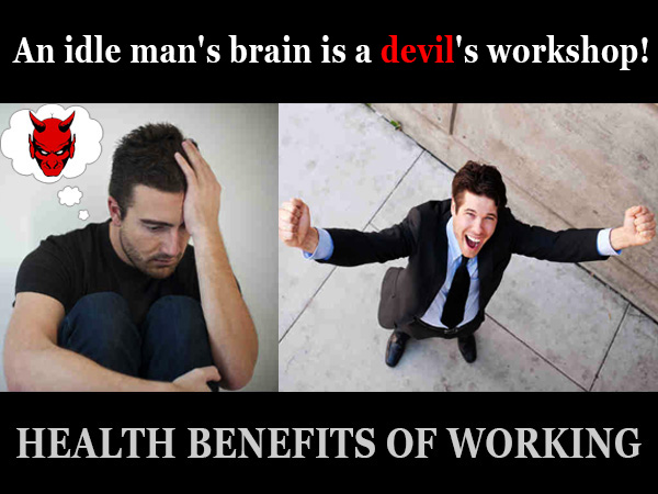So there are health benefits of working regularly. Though many other factors like your actual job and the stress it gives you may also play a role in the big picture, it is a fact that work and health are linked. Both idleness and over work are dangerous.